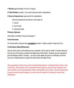- Candidates will have a 5-10 minute meeting with an interviewer to go over the journals, retreat and service experiences.
