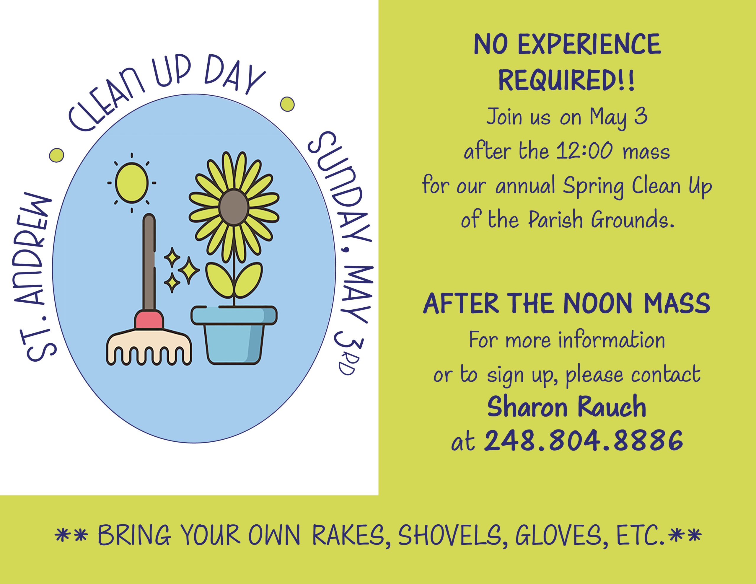 Grab your rakes, shovels and gardening gloves for our annual Spring Clean Up of the parish grounds. No experience necessary. All are welcome!