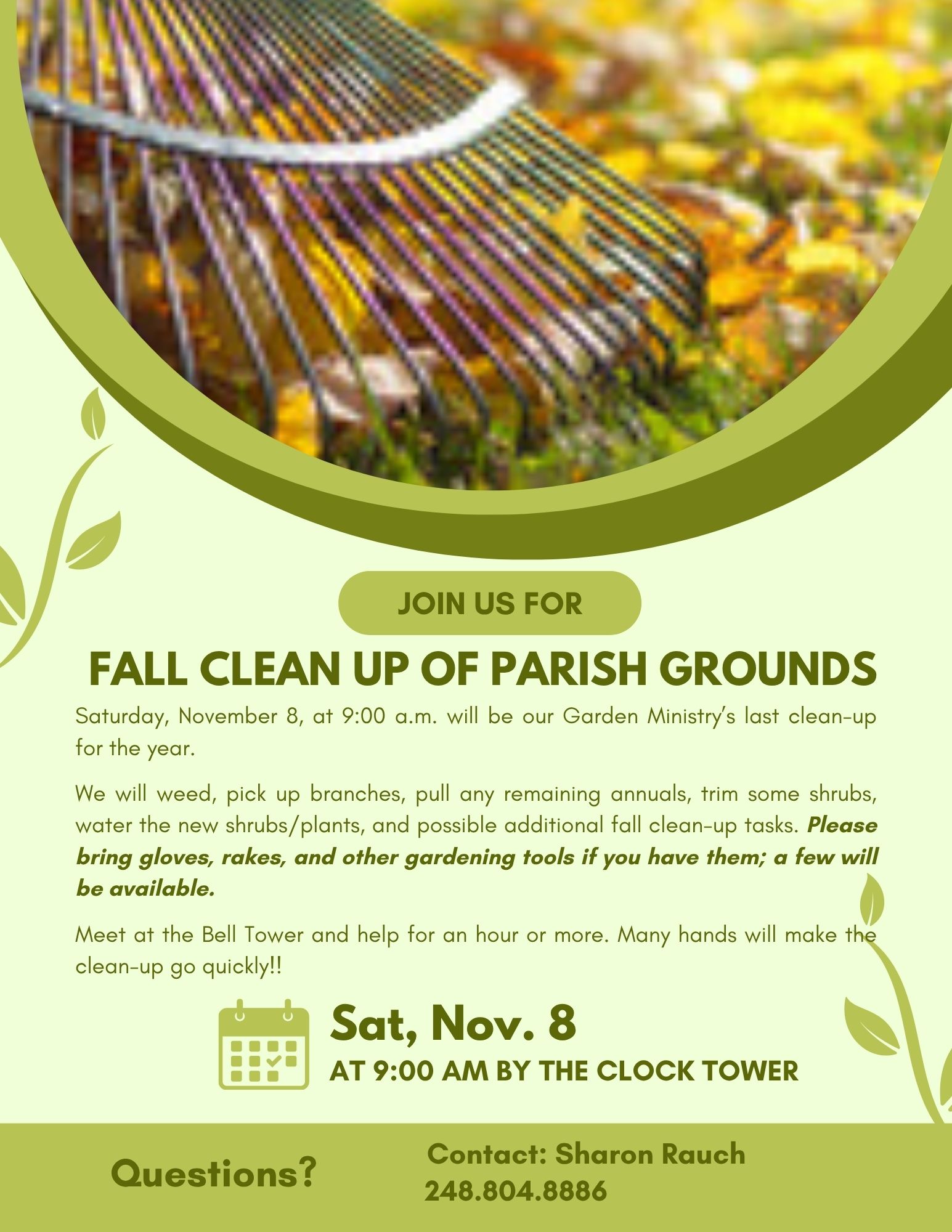 Grab your rakes and gloves and meet at the Clock Tower at 9 am on Saturday, November 8 for prepping our Parish grounds for winter.